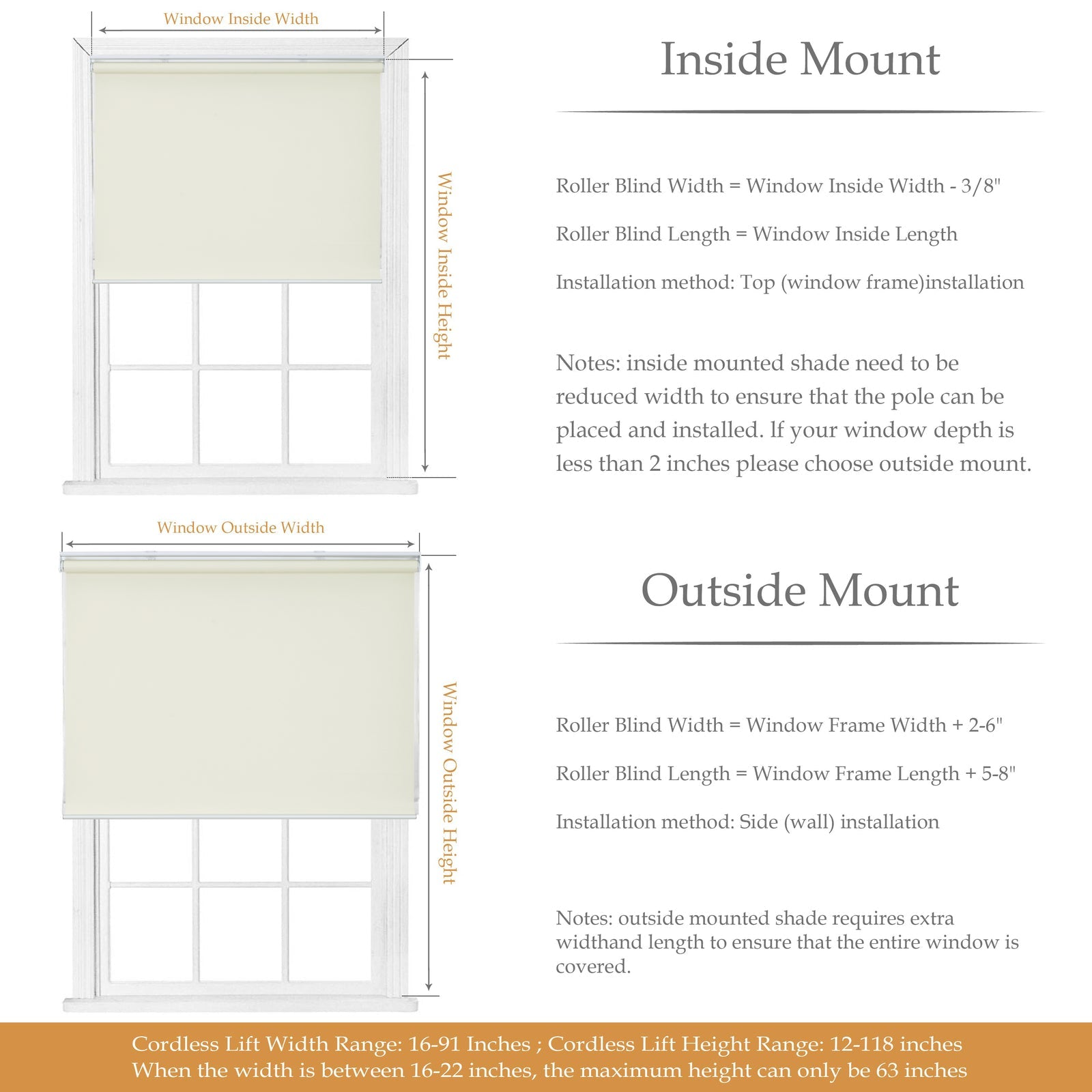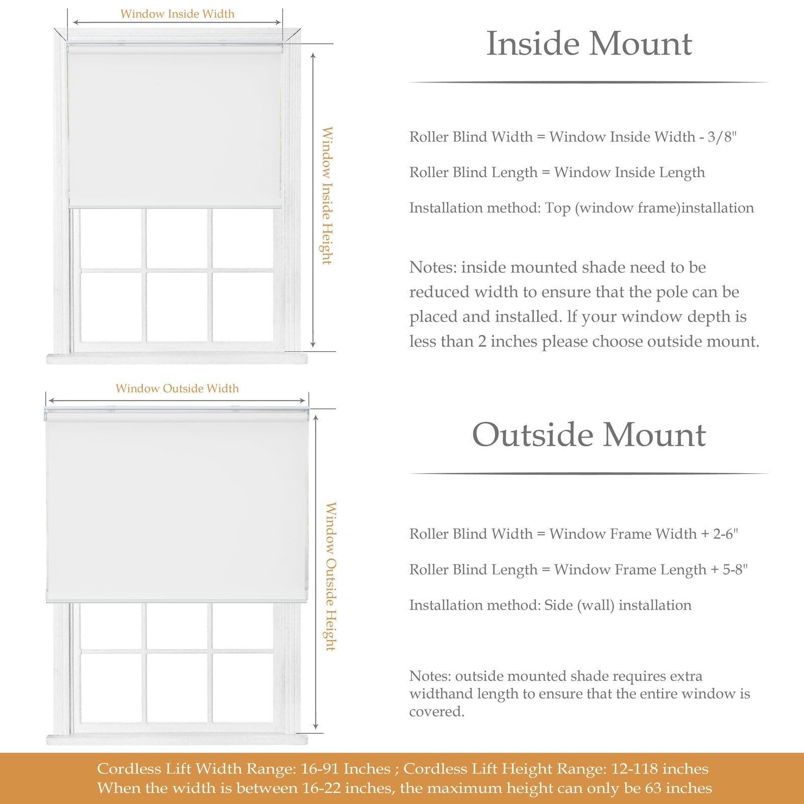 Inside Mount: Measure the window inside width and height. Reduce the measured width by at least 0.4 inches, the height is the same as the measured height. Ensure your window depth is at least 2 inches for inside mounting.