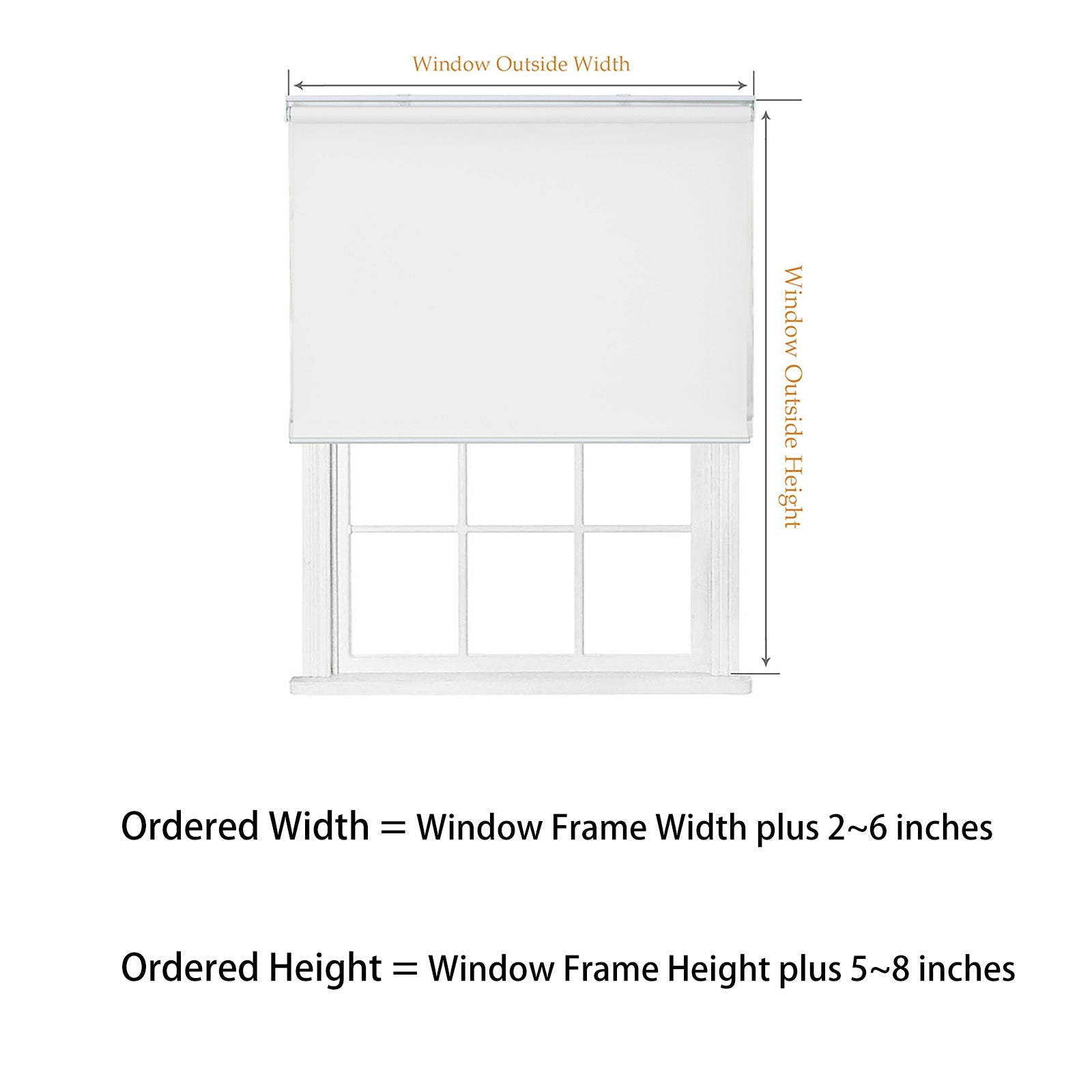 Outside Mount: Measure the window frame width and height. Add 3-6 inches on window frame width, add 5-10 inches on window frame height. Install on the frame, shade size could be same or slightly smaller than window size.